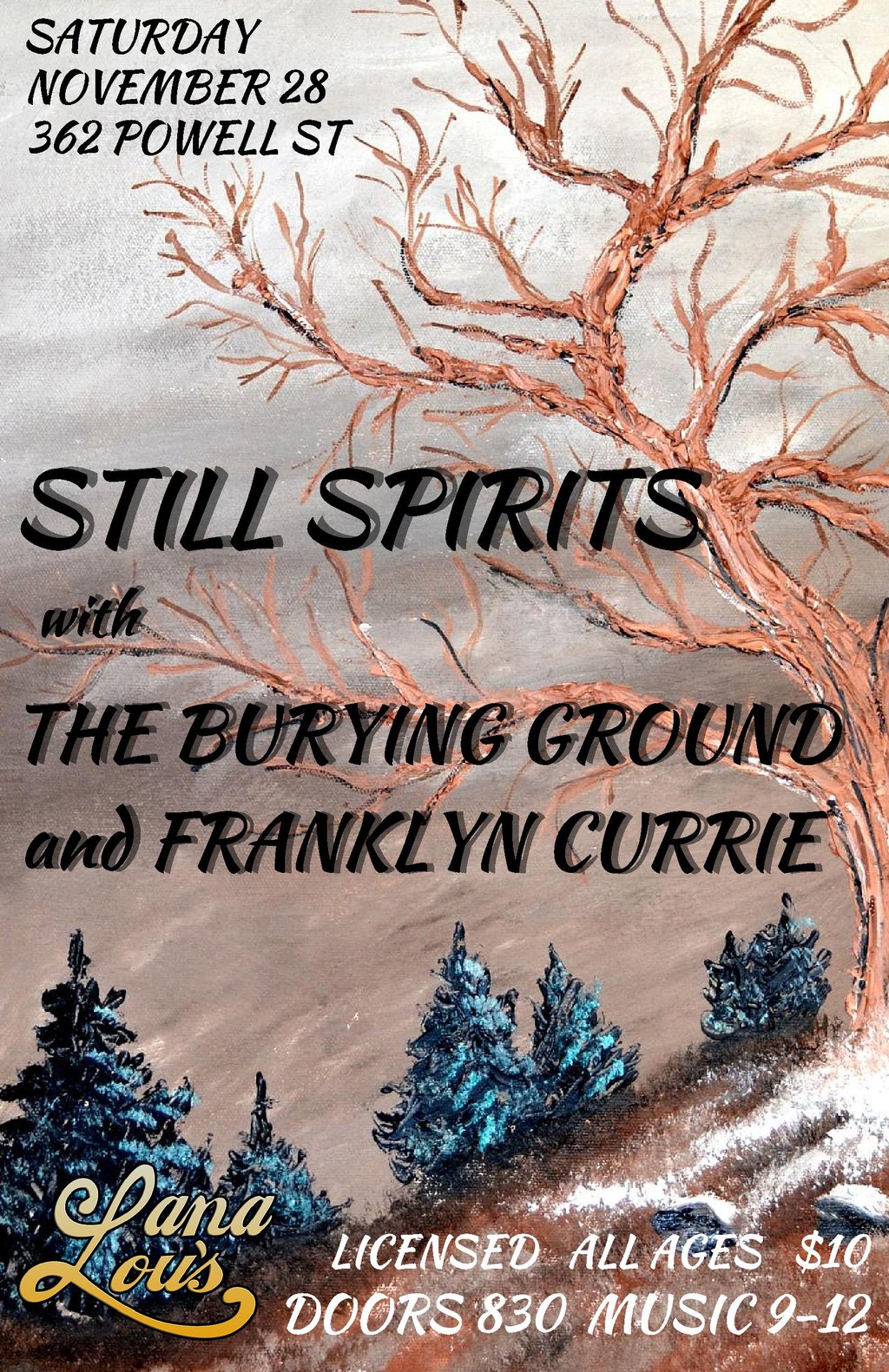 dust off those dancing duds because those backwoods boys the Still Spirits are back in the big city to belt out that jugged up raggrass they do oh so well. very excited to have The Burying Ground on board too ... from chilling to thrilling, original to traditional. flawless, timeless classic country blues and ragtime. and opening the evening is my bud Franklyn Currie from the valley, a blues laden folk country balladeer with all sorts of swagger. looking to laugh and stomp a little? look no further!