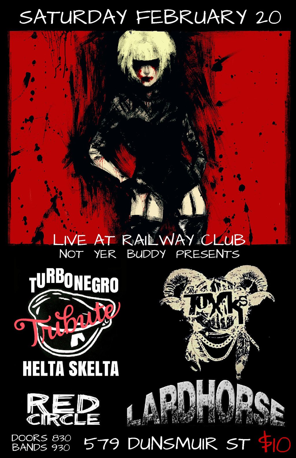 with degenerate trash rockers The Toxiks, grungy garage psych punkers Red Circle, the return of the greased beast Lardhorse and those sAss cobras in Canadian pleather Helta Skelta ... bangin out all the best Turbonegro tunes!!