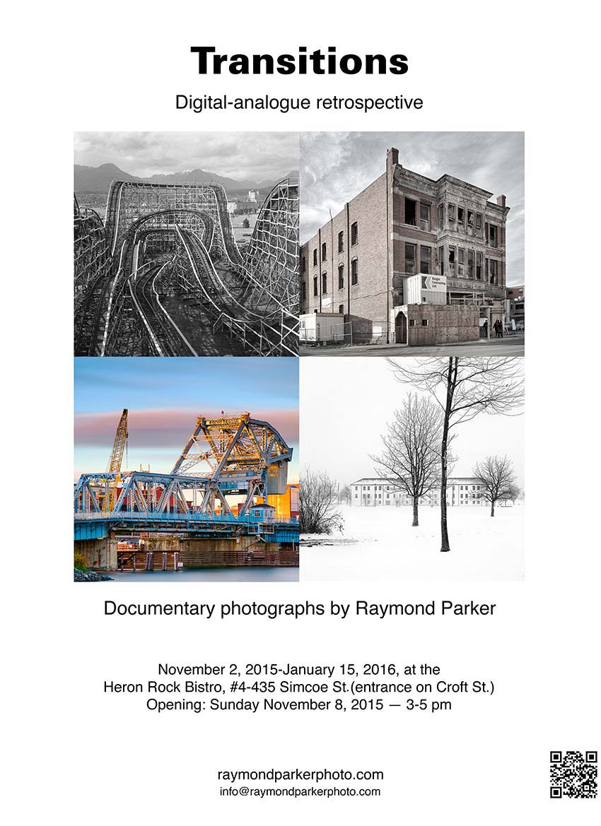 Images from Raymond Parker's Eighties Vancouver portfolio, up to recent urban Victoria images, with representations from analogue vintage silver gelatine prints, through film/digital and pure digital photographs. Both urban and wild landscapes are represented.