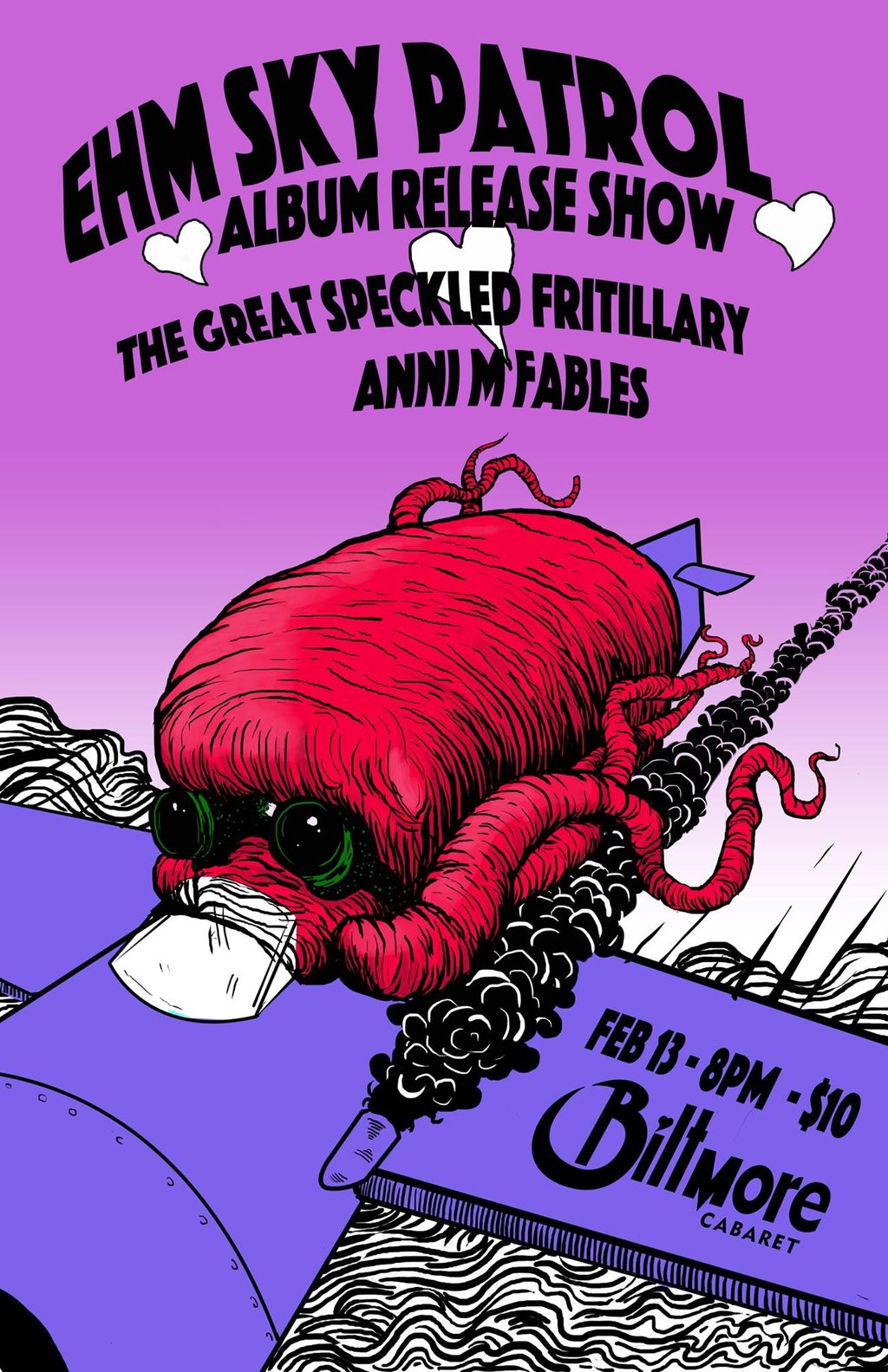 This show promises to be a Valentine's Spectacular, with songwriter-violinist Anni M Fables opening up the evening with her romantic, gypsy heroine folk tunes, followed by 60's style psychedelic folk rock group The Great Speckled Fritillary decked in their finest red and whites, and finally the EHM Sky Patrol will be headlining as an 8-peice, transporting the audience to the golden age of motown and country with sweeping choruses, funky organs and four part harmonies.