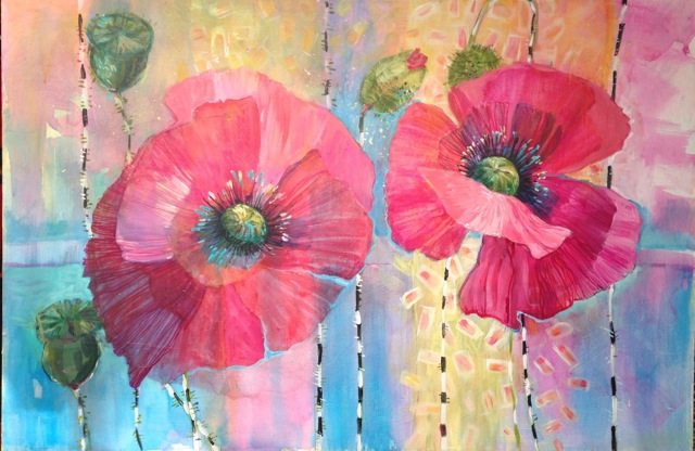 Fluid acrylics and layered glazes enable Jennifer McIntyre to create lush tropical environments filled with birds and flowers. Subtle and complex colours are a signature of her work. Imaginative flights both surreal and fantastical are inscribed on canvas. Poppy paintings evoke dance movement, gestures ever changing across several permutations. Above all, her work is joyful, colourful and expressive.