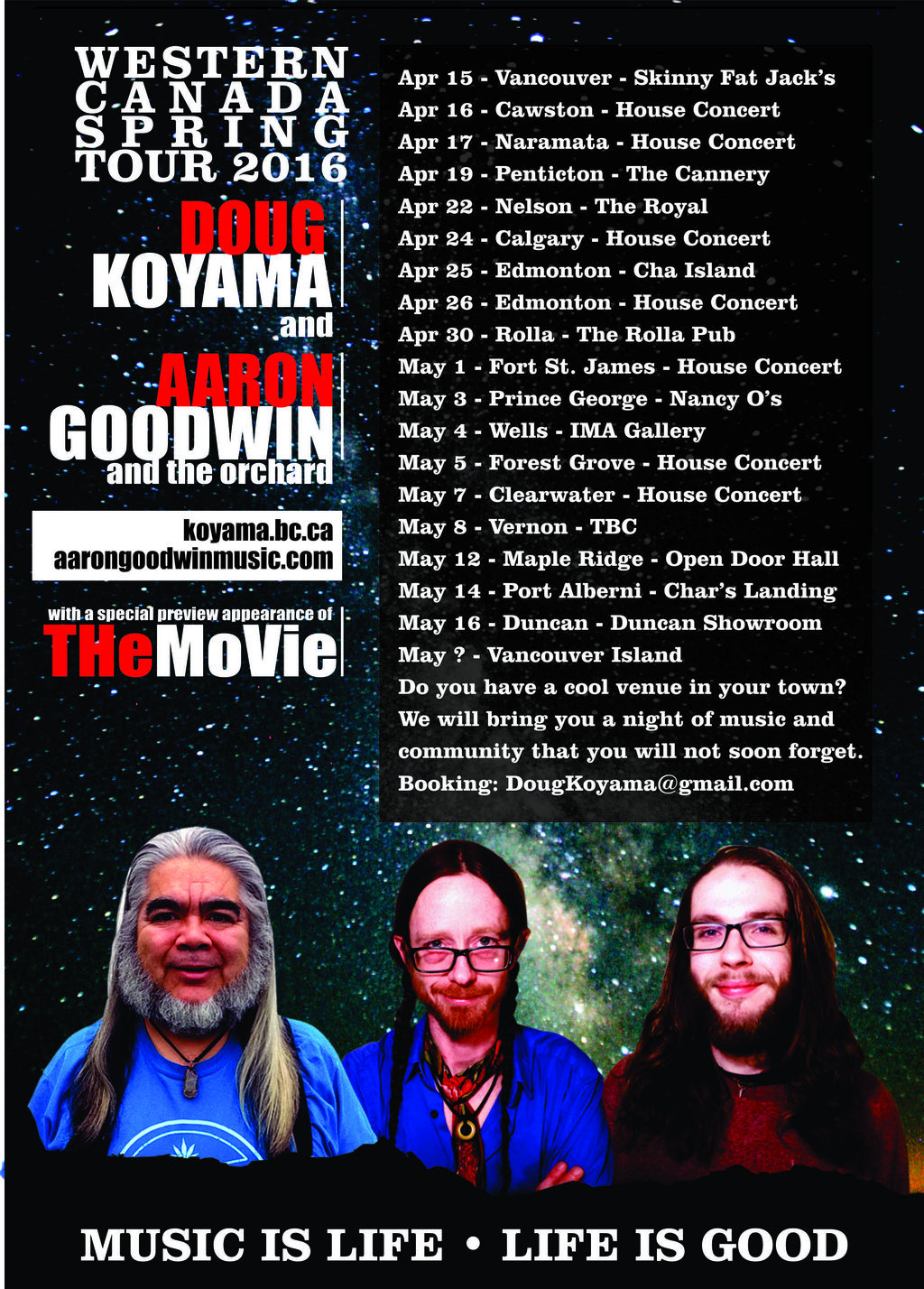 The Movie is a conceptual group that we have created for this tour. It will feature the three of us making songs based in constructs that we have developed for this purpose. Different combinations of instruments and musical styles will mean an endless number of possible combinations which will lead to moments of pure musical magic.