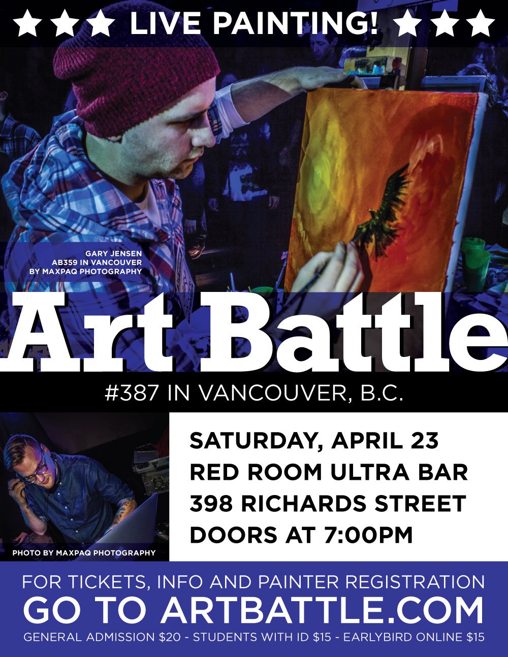 Join us downtown Vancouver at Red Room for an exciting night of live competitive painting on Saturday, April 23rd! Doors open at 7PM, all Vancouver AB events are 19+ http://artbattle.ca/ab/ab387-vancouver/