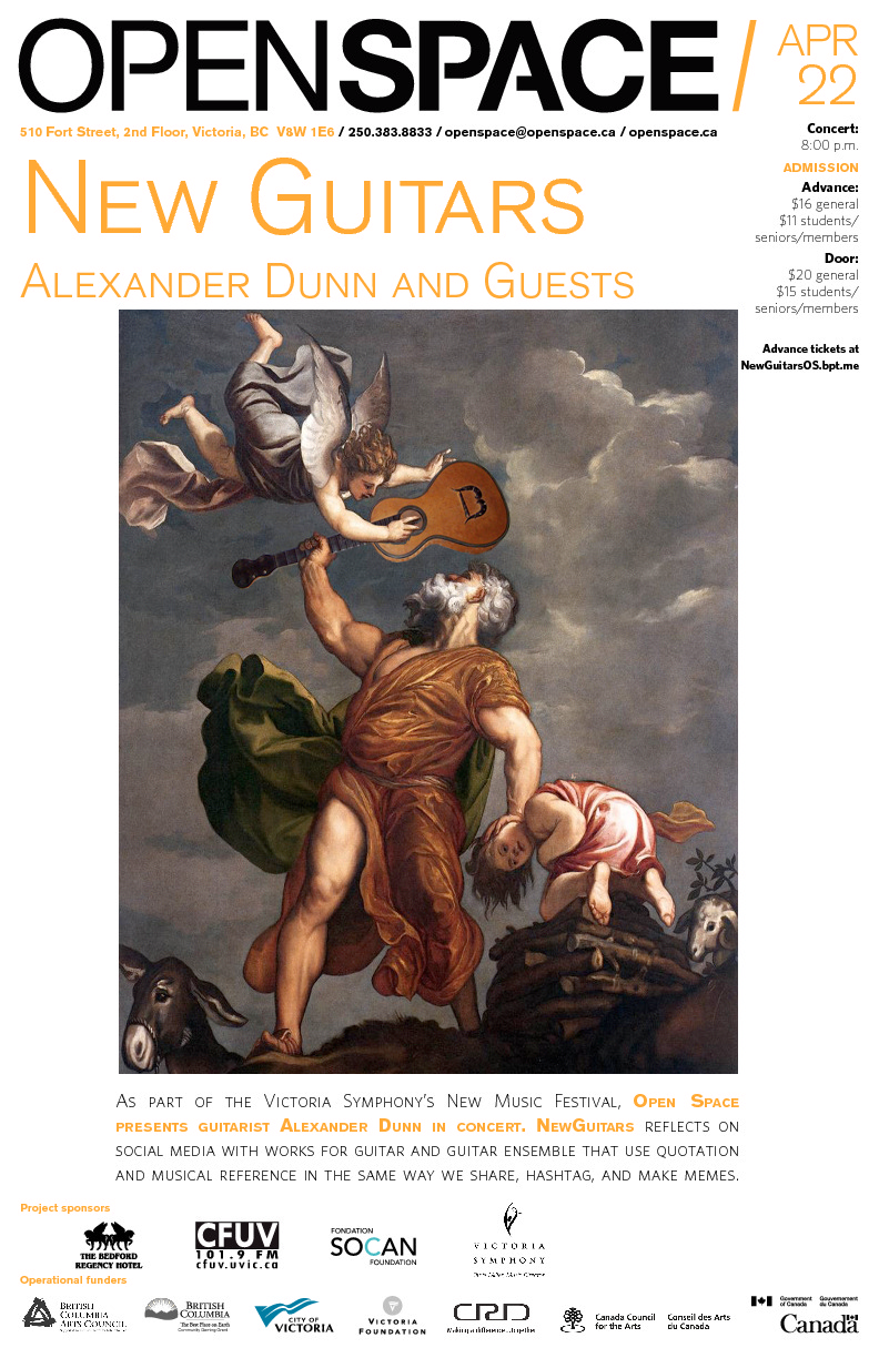 On April 22, 2016 at 8:00 p.m. Open Space presents New Guitars featuring Alexander Dunn with guitarists Robert Ward, Douglas Hensley, Brian Desjarlais. Guests Sylvina Samuel (cello), Alex Olsen (contrabass) and Alex Jang (conductor) will join the ensemble to present a concert of new music for acoustic guitars. In conjunction with of the Victoria Symphony Orchestra’s New Music Festival, this concert follows themes reflecting on social media.