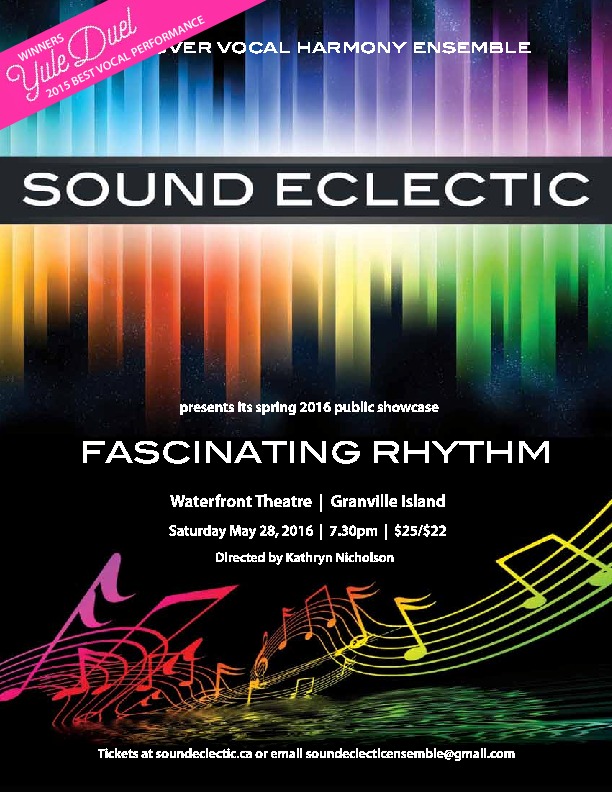 Still buzzing from our Yule Duel victory five months ago, Vancouver vocal harmony ensemble Sound Eclectic is proud to present its 2016 public showcase: Fascinating Rhythm!