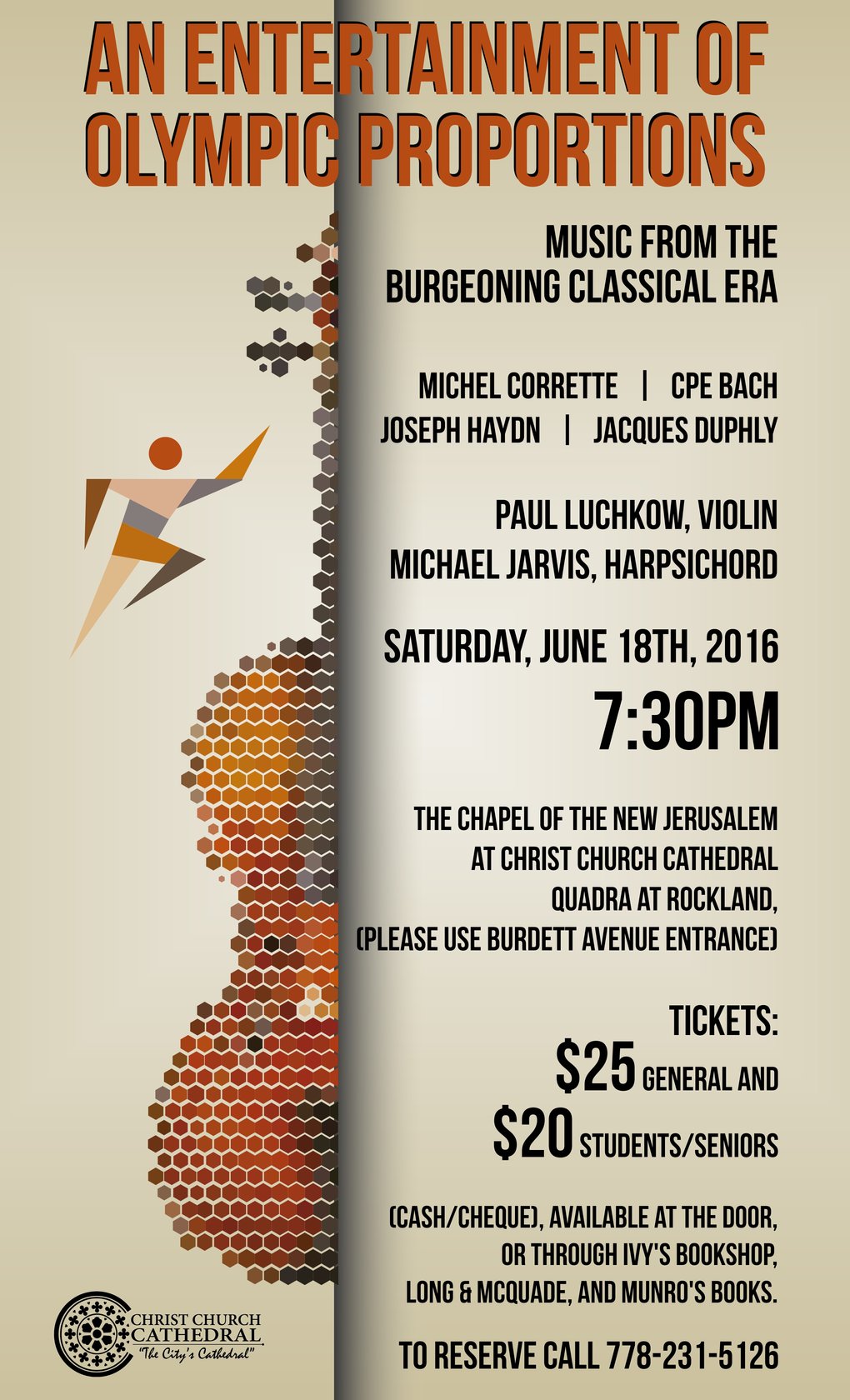 Violinist Paul Luchkow, and harpsichordist Michael Jarvis explore the early Classical period with music by C.P.E. Bach, Jacques Duphly, Joseph Haydn, and Michel Corrette, including his exuberant sonata "Les Jeux Olympiques"