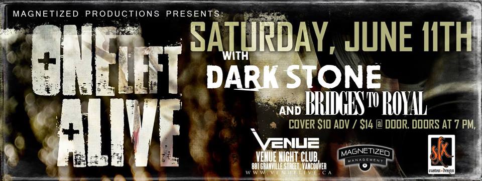 Magnetized Productions Presents:: One Left Alive with Dark Stone and Bridges To Royal.. Saturday, June 11th at Venue Night Club, 881 Granville Street, Vancouver.