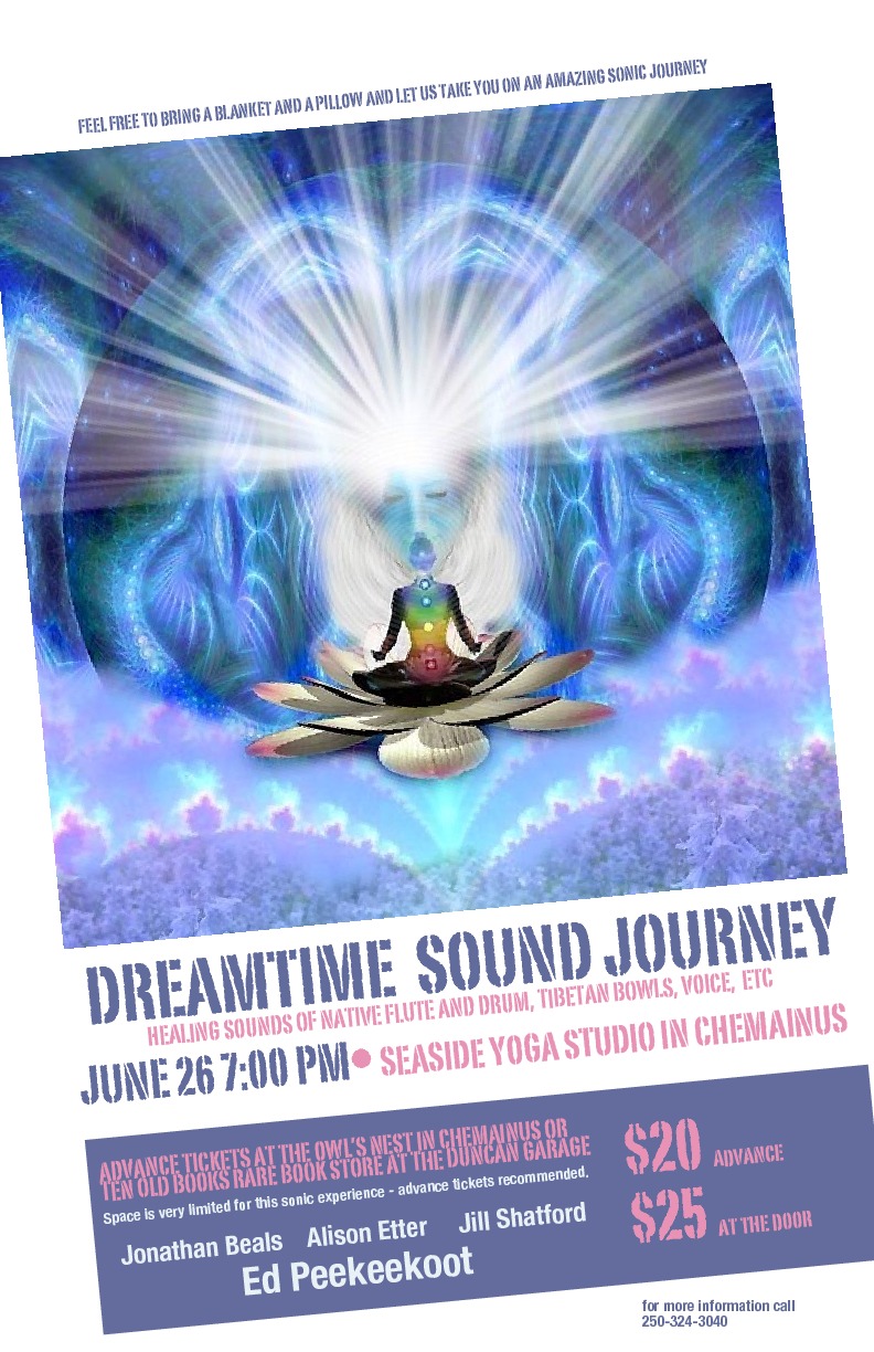 Alison Etter, Ed Peekekoot, Jill Shatford and Jonathan Beals are collaborating to create a Dreamtime Sound Journey – an evening out of the ordinary. This event will be a weaving together of sacred sound to soothe, relax and transform. Native flute and drum, voice, Tibetan singing bowls, and various other harmonic instruments will take you on a healing journey to the heart of your soul. Experience the power of intentional, healing sound.
