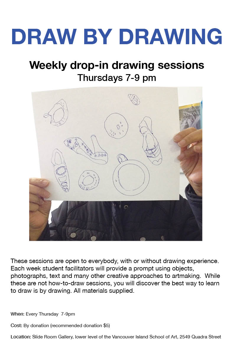 These sessions are open to everybody, with or without drawing experience. Each week student facilitators will provide a prompt using objects, photographs, text and many other creative approaches to artmaking. While these are not how-to-draw sessions, you will discover the best to learn to draw is by drawing. All materials supplied.
