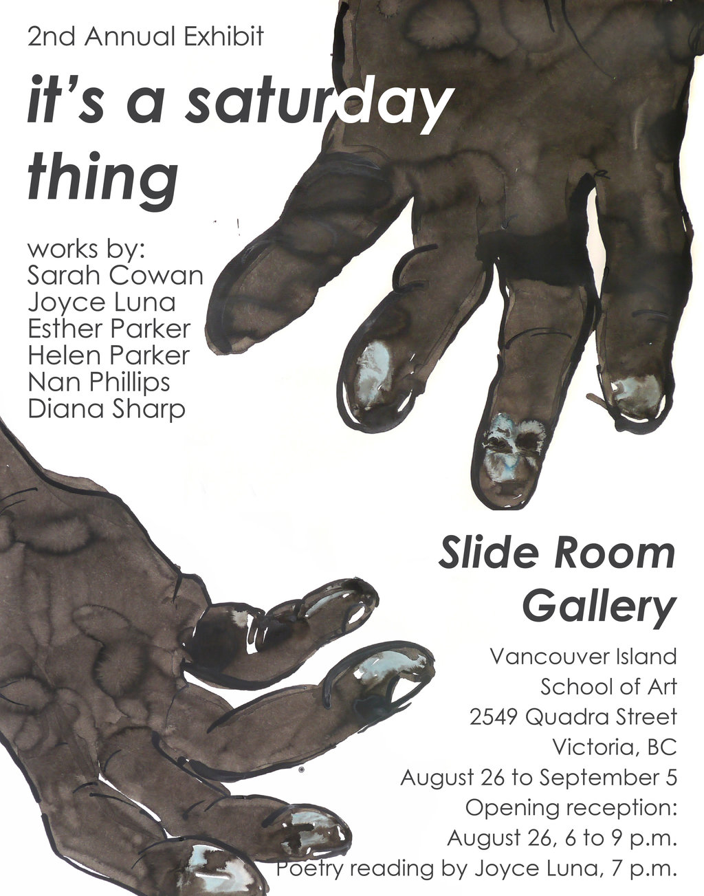 it's a saturday thing: Sarah Cowan, Joyce Luna , Esther Parker, Helen Parker , Nan Phillips , Diana Sharp  @ Slide Room Gallery Aug 26 2016 - Jan 12th @ Slide Room Gallery