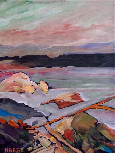 Marie Nagel's abstract landscapes capture an elemental quality of our West Coast environment. She harnesses the wind and energy of our wild coast without trying to be representational. Marie is a member of Victoria's Al Frescoes plein air painting group. "Painting is the way for me to have a strong voice," says Nagel. "I like thick paint...and just the act of painting is the most important thing in the world to me."