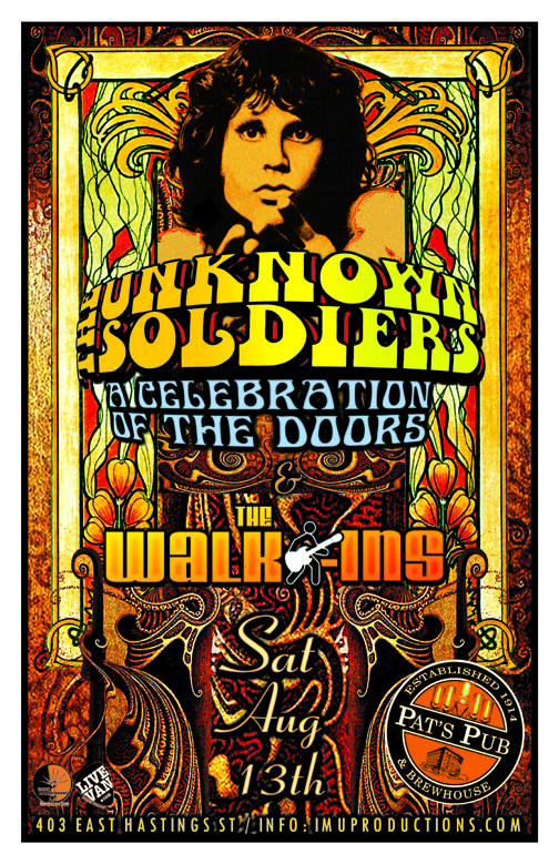 . Saturday, August 13th IMU presents The UNKNOWN SOLDIERS A Celebration Of The Doors w/ The WALK-INS @ Pat's Pub 403 East Hastings Street. Doors 8:30pm / Show 9pm sharp! $10 cover