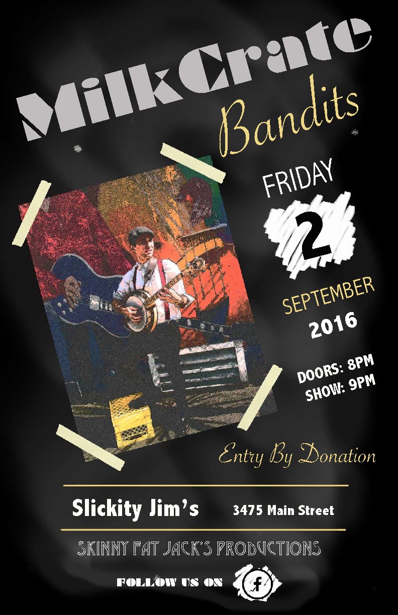 The Milk Crate Bandits are heading south for the fall but before they do come party at Slickty Jims with two sets of hot jazz fun, New Orleans grooves and good times for days.