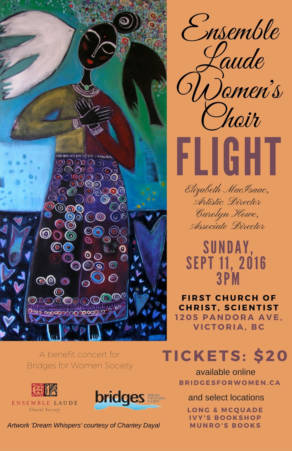 A benefit concert for Bridges for Women Society. Come hear the beautiful sounds of Ensemble Laude Women's Choir for a creative blend of medieval repertoire and contemporary choral works from around the world with Elizabeth MacIsaac, as Artistic Director, and Carolyn Howe, as Associate Director. Ensemble Laude celebrates the beauty and resilience of women’s vocal traditions through the ages and seek to share this art form through joyful, soulful, and life-enhancing performances that gladden the heart, lift the spirit, and expand the mind.