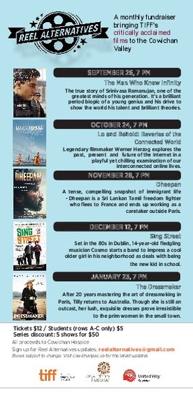 Reel Alternatives is a monthly fundraiser bringing Toronto International Film Festival's critically acclaimed films to the Cowichan Valley. All proceeds go to Cowichan Hospice.