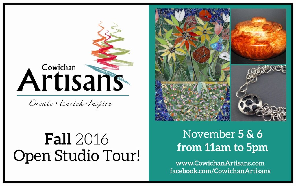 The Cowichan Artisans are opening their studios for their 2016 Annual Fall Studio Tour. Saturday November 5th and Sunday November 6th, between 11 am and 5 pm both days. Visit these professional artists in their studios, displaying a large range of fine craft in clay, painting, woodwork, glass, mosaics, furniture and jewellery. Visit their website to download a tour map and for more information on the artists. www.cowichanartisans.com