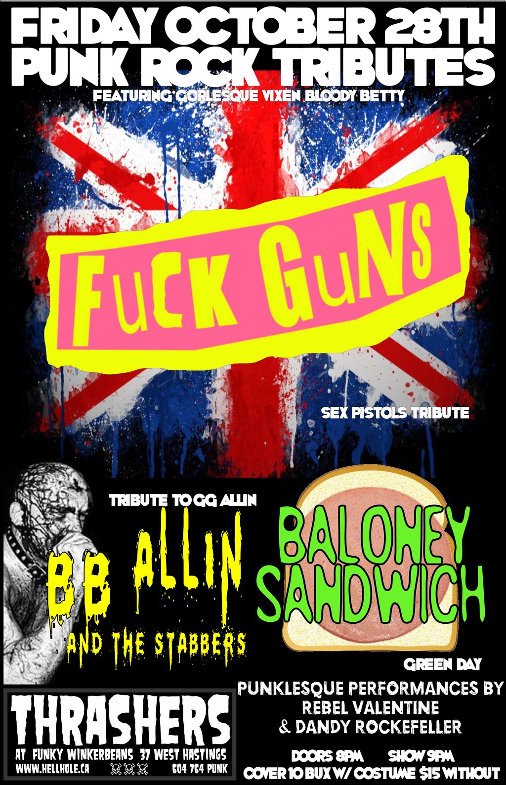 FuCk GuNs: is a Sex Pistols tribute fronted by Bloody Betty/ Izzy Expired and featuring members from Bend Sinister, Vampire Bats/ Burmis Tree and Miss Quincy and The Showdown.