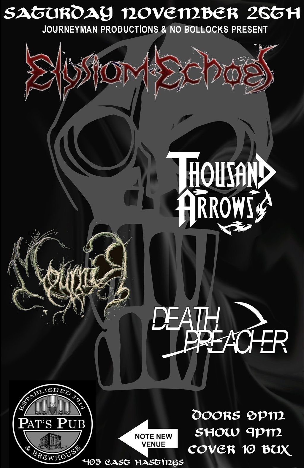 Elysium Echoes, THOUSAND ARROWS, Mournir, DEATH PREACHER @ Pat's Pub Nov 26 2016 - Jan 9th @ Pat's Pub