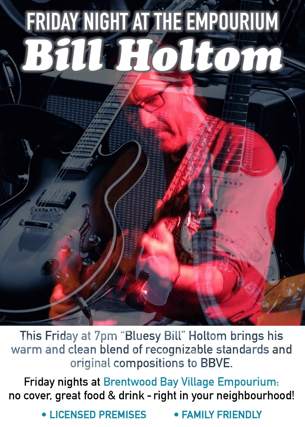 “Bluesy Bill” Holtom brings his warm, clean blend of recognizable standards and original compositions to the Brentwood Bay Village Empourium. Friday nights at Brentwood Bay Village Empourium: no cover, great food & drink, licensed premises & family friendly!
