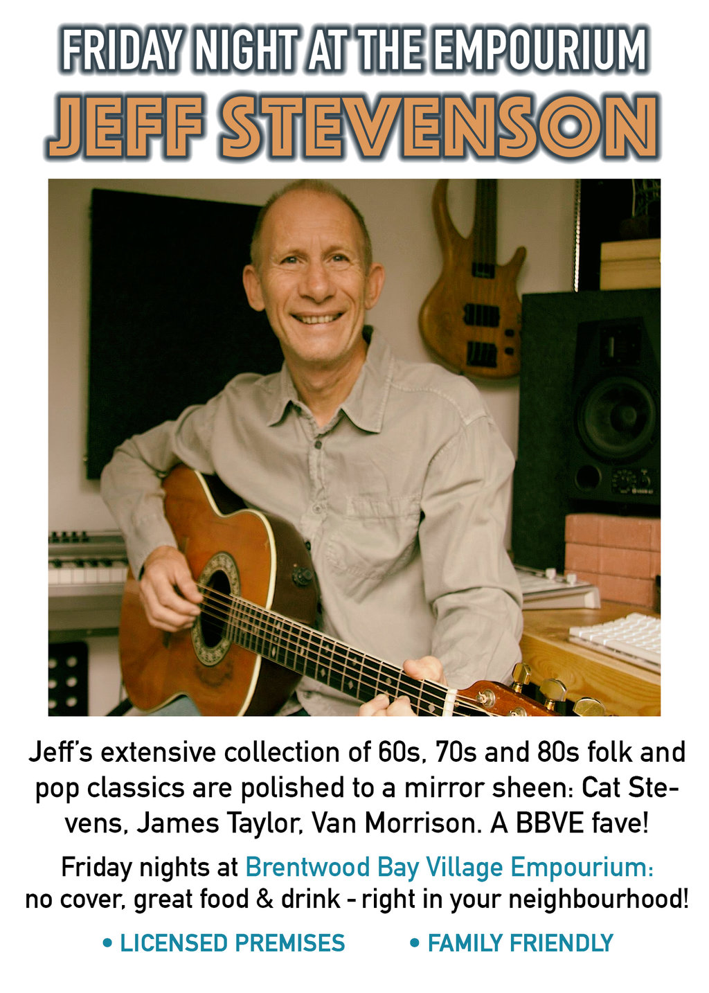 Jeff’s extensive collection of 60s, 70s and 80s folk and pop classics are polished to a mirror sheen: Cat Stevens, James Taylor, Van Morrison. A BBVE fave!