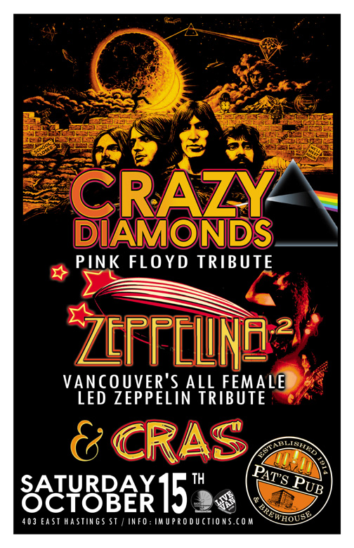 . Saturday, October 15th IMU presents CRAZY DIAMONDS Pink Floyd Tribute, ZEPPELINA.2 (All Female Tribute to Led Zeppelin) & CRAS @ Pat's Pub, 403 East Hastings Street. Doors 8pm / Show 9pm / $10 cover