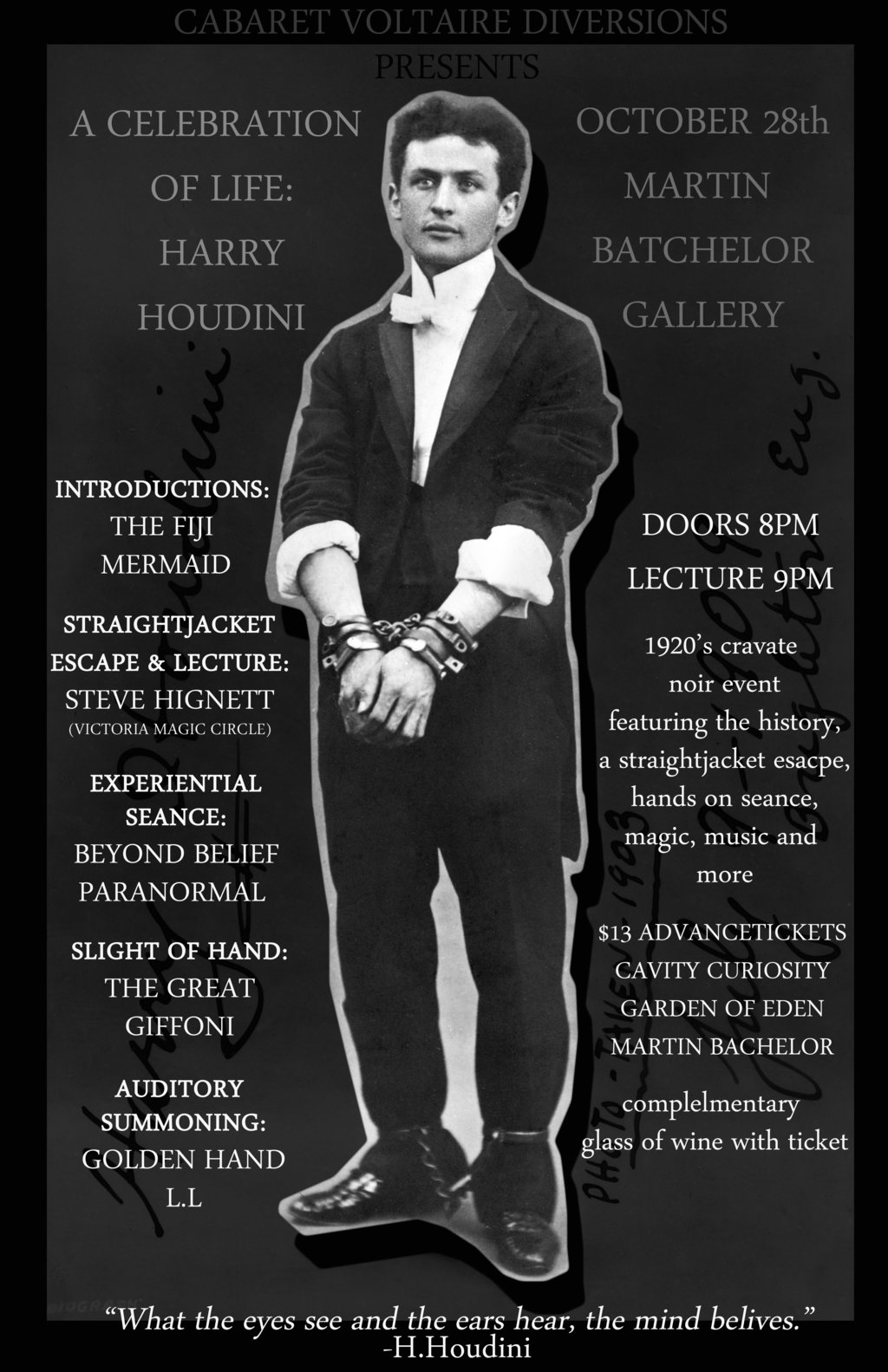 The evening will begin with a concise and complete lecture about Houdini by Victoria Magic Circle member, acclaimed illusionist, and Houdini Historian, Steve Hignett.