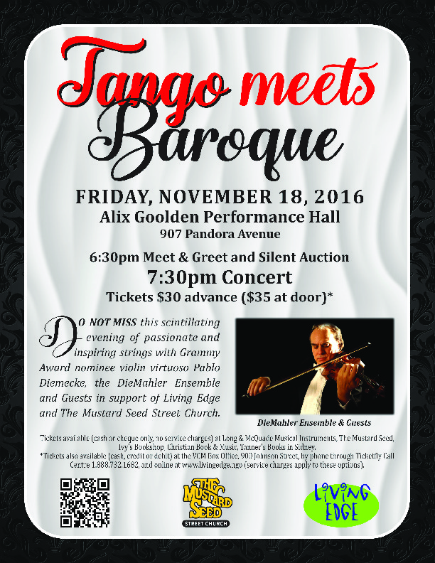 DO NOT MISS this scintillating evening of passionate, inspiring strings with Grammy Award nominee violin virtuoso Pablo Diemecke, the DieMahler Ensemble and Guests in support of Living Edge and The Mustard Seed Street Church. Both Living Edge and The Mustard Seed work to fight hunger and restore faith in Greater Victoria. Pablo Diemecke served as Concertmaster of the Victoria Symphony for 20 years and is regarded as one of Canada’s finest virtuoso violinists. The critically acclaimed DieMahler Ensemble is in its fifth year of delighting audiences here at home and now abroad as well. The evening’s program will include soul-stirring selections from Vivaldi and Handel, juxtaposed against earthy, rhythmic, passionate tangos.