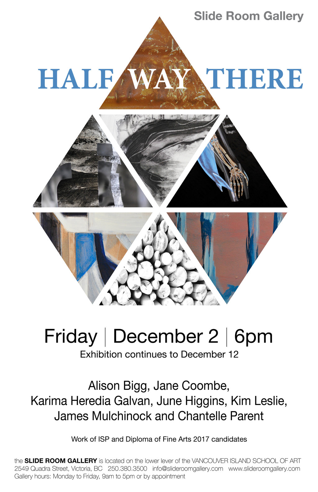 This group exhibition showcases work by the Vancouver Island School of Art’s Diploma of Fine Art and Independent Studio Program graduate candidates: Alison Bigg, Jane Coombe, Karima Heredia Galvan, June Higgins, Kim Leslie, James Mulchinock and Chantelle Parent.