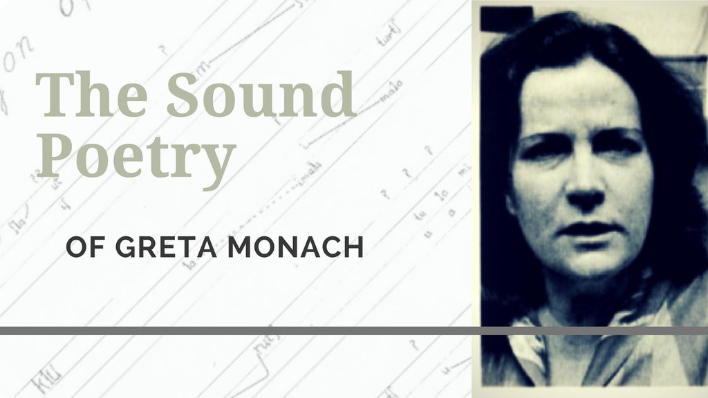 The Sound Poetry of Greta Monach is rarely heard. Even a google search of her work only finds a handful of examples of her work. Monach’s sound poetry is often made up of single spoken sounds, abstracting words to their pure elements. Some of the poems are written to be performed by a single voice, others up to a quartet of voices. When seen on paper, they resemble musical score more than written poetry.