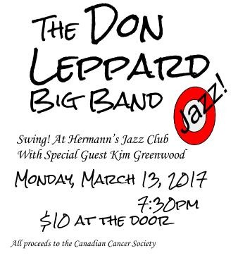 This will be a night of big band swing music with the Don Leppard Big Band! The night will feature swinging' tunes by the band and the vocal offerings of songstress Kim Greenwood. This will be a fundraiser and all proceeds will go to the Canadian Cancer Society.