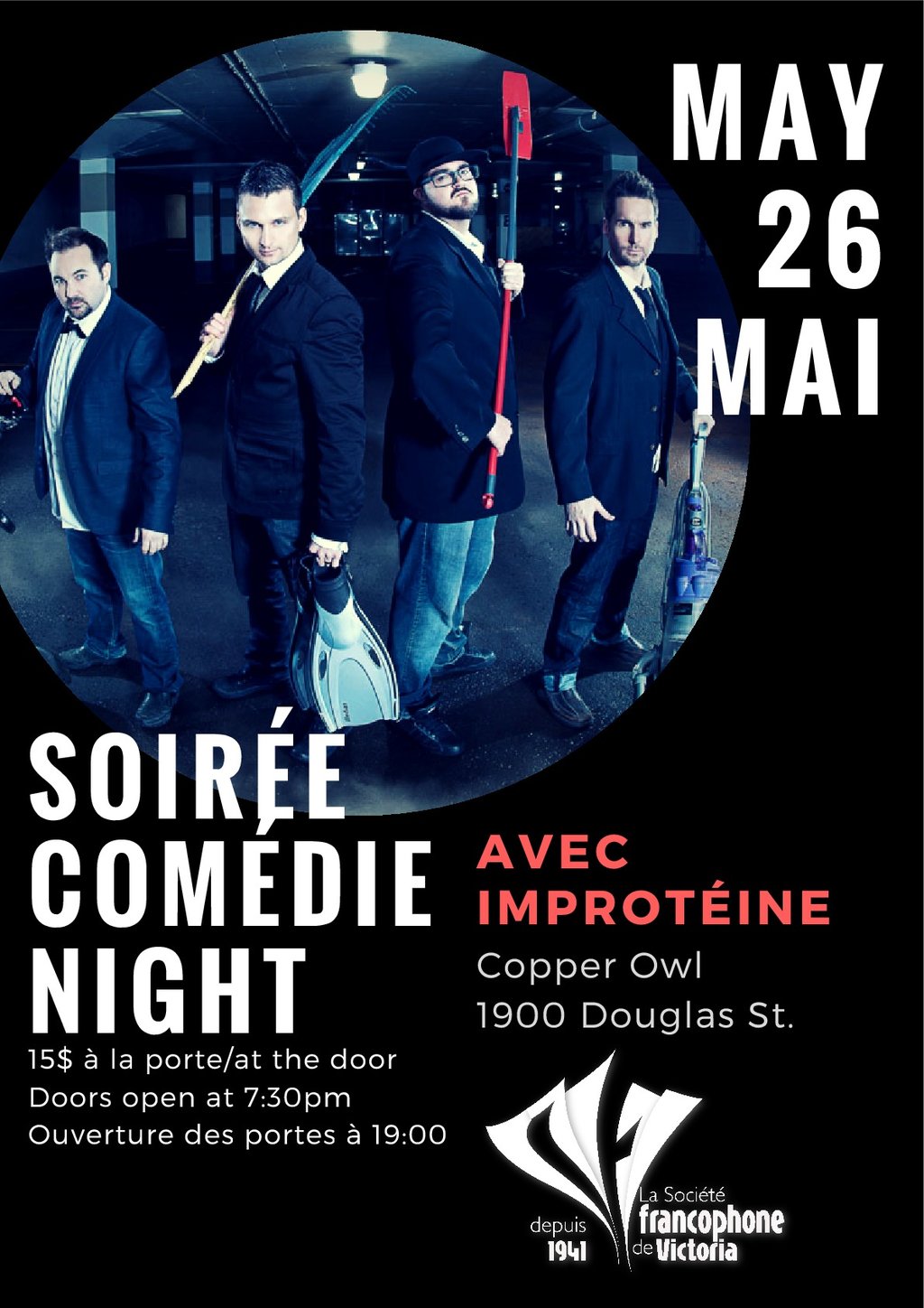 Sit back and relax into one of the legendary Copper Owl chairs and laugh at the completely improvised show presented by Improtéine! On the menu; laughter, a delirious atmosphere and lots of fun! Do not miss this unique opportunity! Doors open at 7:30pm, show will start at 8pm.
