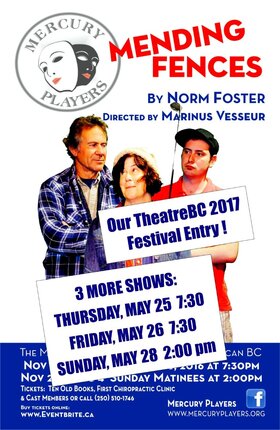 3 more chances to watch the [Improved] Mending Fences show by the Mercury Players! It was a hilarious and dramatic success, last November, so we decided to put it on again and enter it into the TheatreBC 2017 festival. If we win this 'locally', we'll take the production to the provincial festival in Vernon in July.