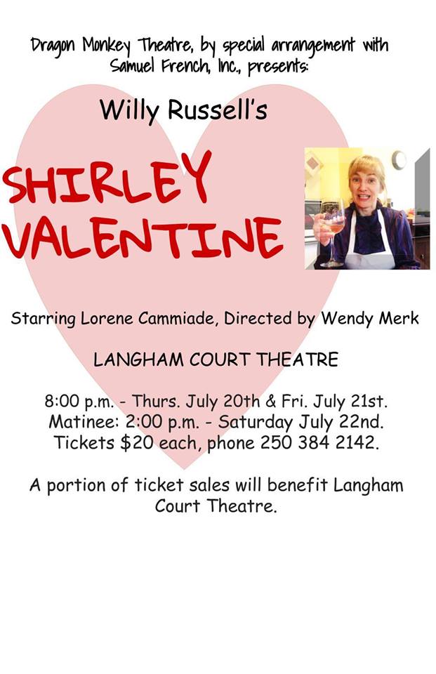 Dragon Monkey Theatre, by special arrangement with Samuel French, Inc., presents:Willy Russell's timeless comedy SHIRLEY VALENTINE, Starring Lorene Cammiade, Directed by Wendy Merk.
