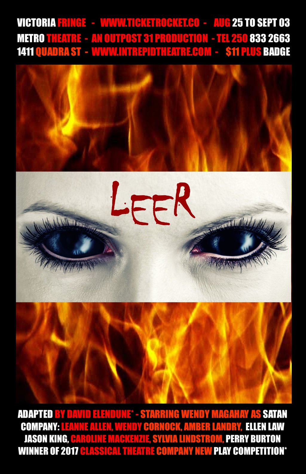 All Hell is sure to break loose at this summer’s Victoria Theatre Fringe Festival when Satan divides her realm between her three daughters in the world premiere of LEER, a horrifyingly humorous, all female affair by award winning local writer David Elendune (Winnie The Pooh/Casino Royale).