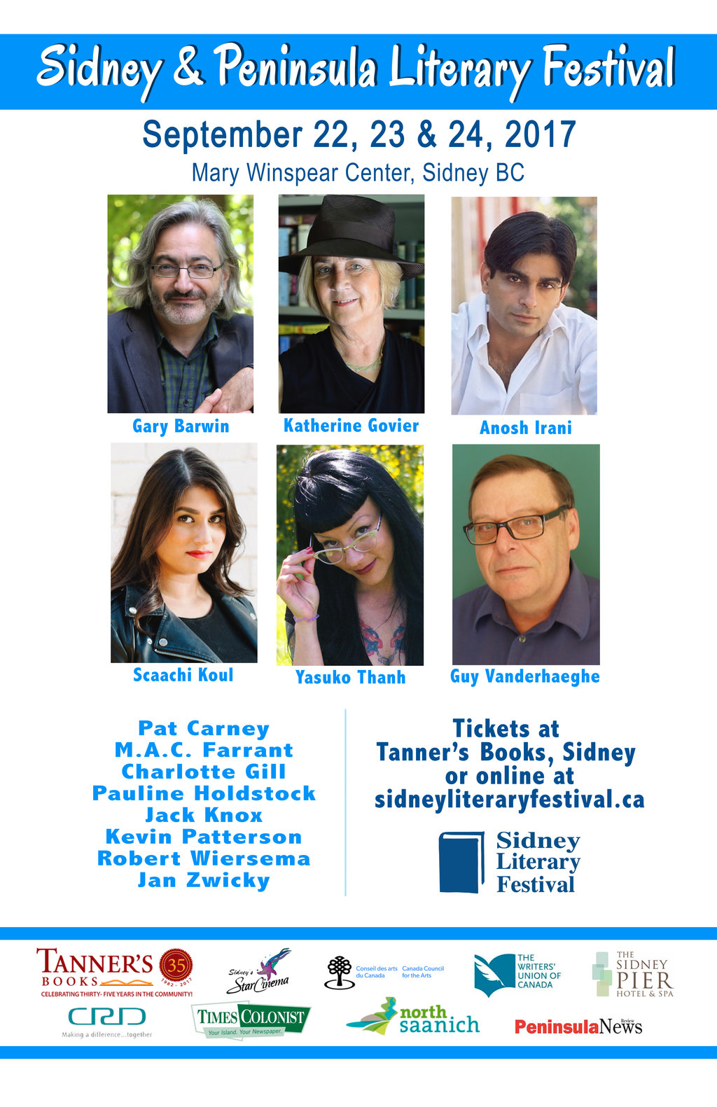 Sidney & Peninsula Literary Festival: Pat Carney, M.A.C. Farrant, Charlotte Gill, Pauline Holdstock, Jack Knox, Kevin Patterson, Robert Wiersema, Jan Zwicky, Gary Barwin, Katherine Govier, Anosh Irani, Scaachi Koul, Yasuko Thanh, Guy Vanderhaeghe @ Mary Winspear Centre Sep 24 2017 - Dec 13th @ Mary Winspear Centre