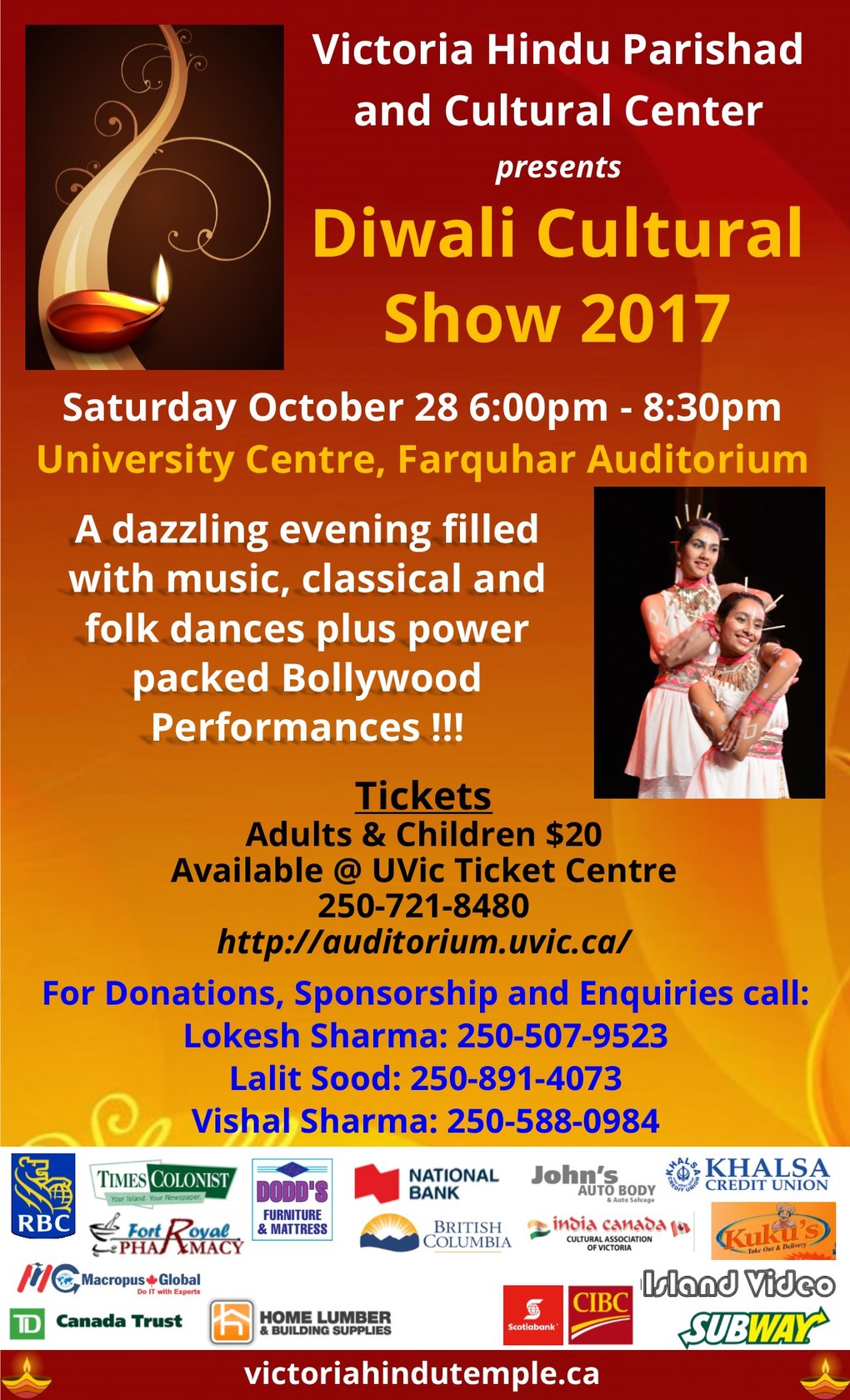 This is one of the most beautiful and widely attended events of its kind in Victoria. This show attracts over a thousand attendees including the Canadian mainstream audience who love the show and come back year after year. Diwali program consists of a variety of Indian classical, folk, bollywood, bhangra, dances from South India, Hindi and Punjabi songs, as well as musical entertainment