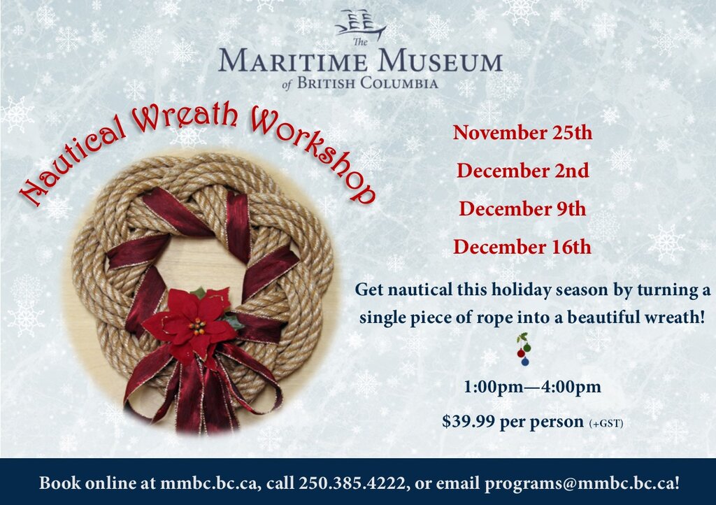 Get ready for the holidays, while learning a thing or two about knots, at the Maritime Museum of British Columbia`s Nautical Wreath Workshop!
