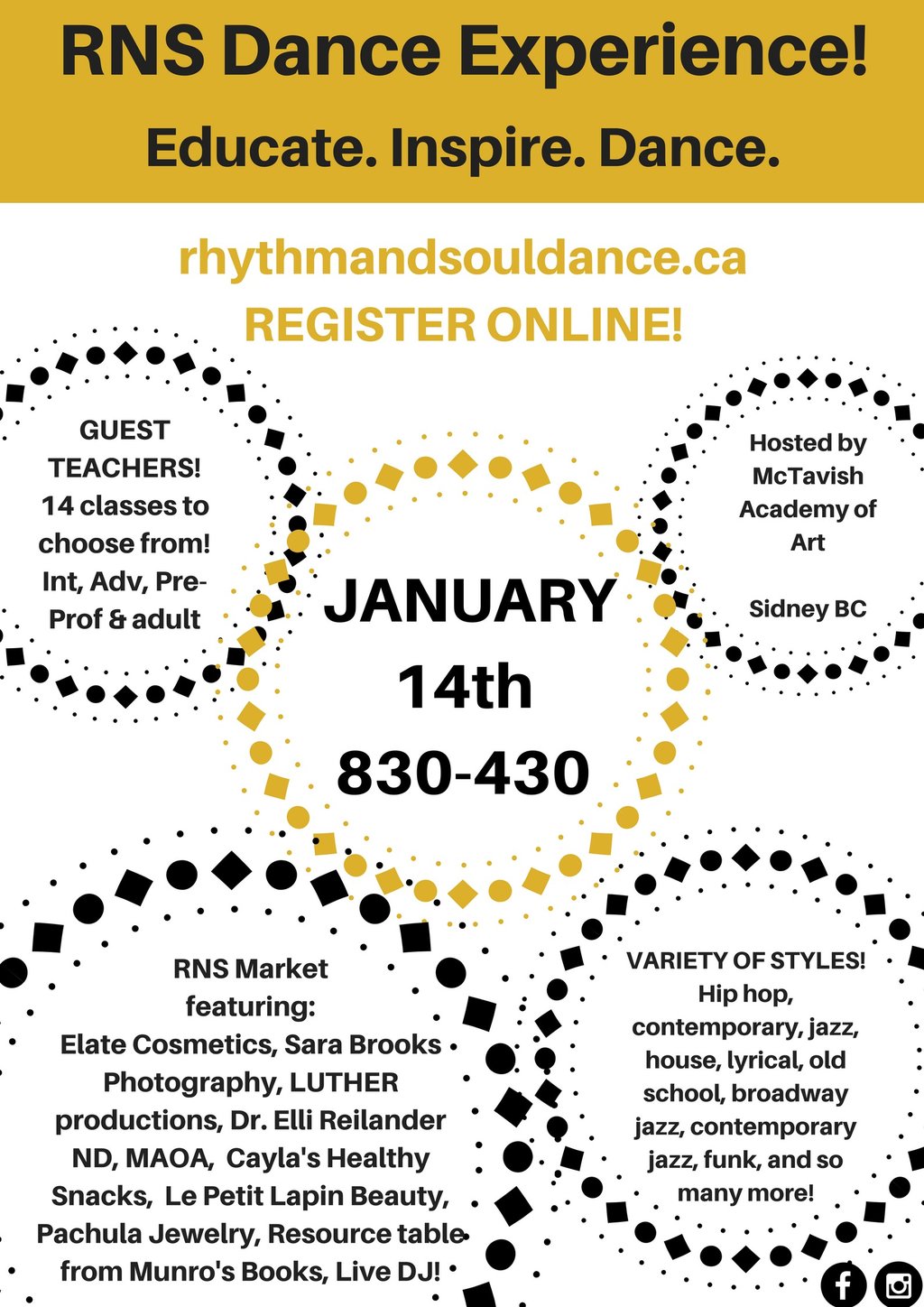 This day is made for local dancers aged 11+, and is a day full of education, inspiration, and dance! RNS Dance Inc is made up of two local gals who have been dancing and teaching on the island for over 20 years. Bringing together faculty from the Vancouver area, and showcasing local entrepreneurs, this day is going to be an amazing day for dancers of Victoria!
