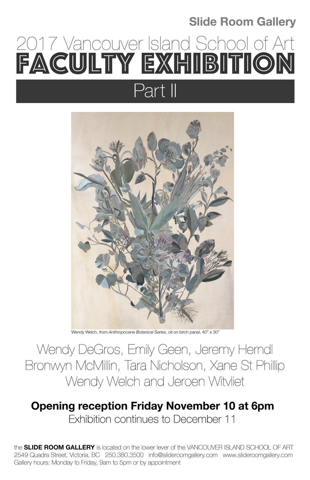 We are pleased to announce the 2017 VISA Faculty Exhibition Part II is the next exhibition to open at the Slide Room Gallery! Showcasing work from the faculty at the Vancouver Island School of Art. This is the second of a two part series of exhibitions.