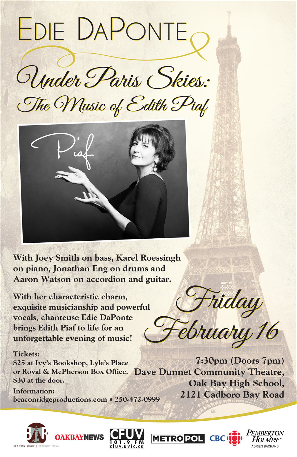 Channelling Piaf, with her rich timbre and captivating stage presence, Edie aims for a completely authentic experience and her experienced band will help create the atmosphere of an intimate Parisian theatre. Joining Edie are long-time collaborator Joey Smith on bass, and local favourites Karel Roessingh on piano, Jonathan Eng on drums and filling the important role of accordionist, Aaron Watson. All these talented musicians have long careers in the Vancouver Island jazz scene. You might not see Edie wearing the characteristic ‘little black dress’ that Piaf was known for – she prefers a little more flare - but she promises to deliver Piaf’s music as it was originally intended, with emotion and love.