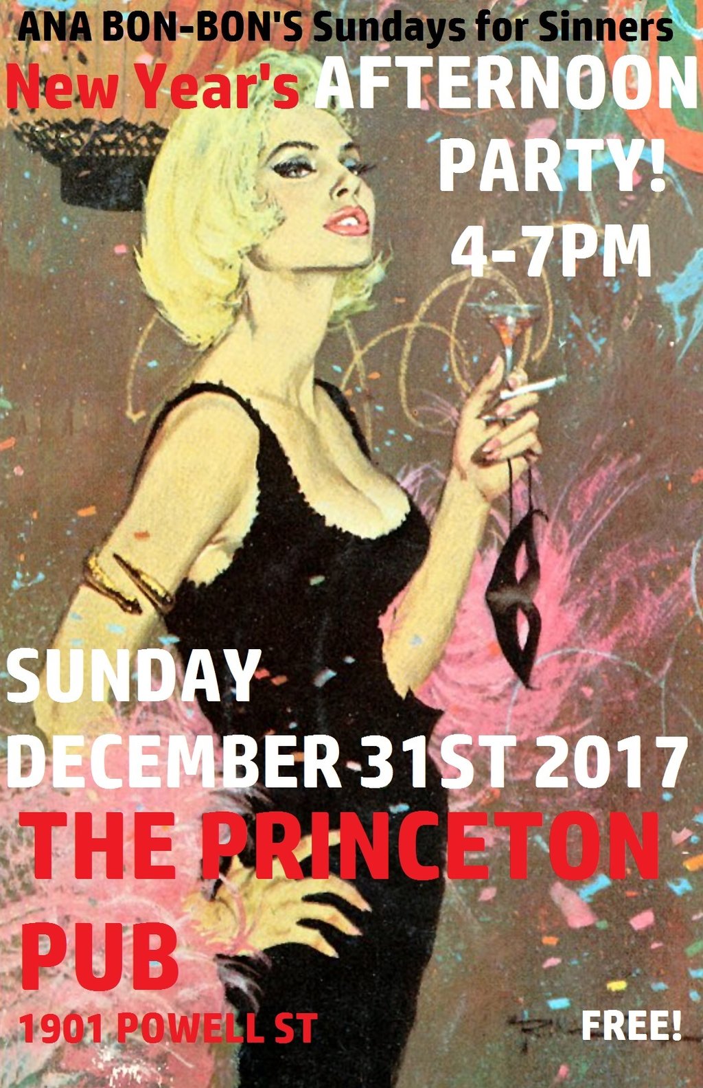Ana Bon-Bon's SUNDAYS FOR SINNERS New Year's Eve AFTERNOON PARTY swings on December 31st, 2017 from 4-7 pm! With Ana Bon-Bon on rhythm accordion and vox, Mike 'The Slider' Kenney on guitar, Taylor 'Trouble' Little on drums, and 'Perfect' Mike Kennedy on double bass, we will be rocking out the old and ringing in the new with our pumping & swooning country blues, EARLY on Dec. 31st afternoon. For those who find the evening simply to short to celebrate enough, start early here! For those who want to celebrate but wish to be at home by midnight, start early HERE! We Love The Princeton Pub! hot food, craft brews and more, trains, pool table, and very friendly people... FREE ENTRY for the Afternoon Show, no minors, 1901 Powell St, Vancouver BC