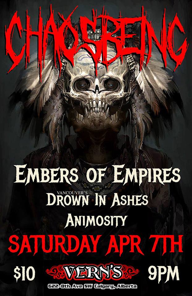 CHAOS BEING, embers of empires, DrownInAshes, Animosity @ VERNS BAR Apr 7 2018 - Jan 10th @ VERNS BAR