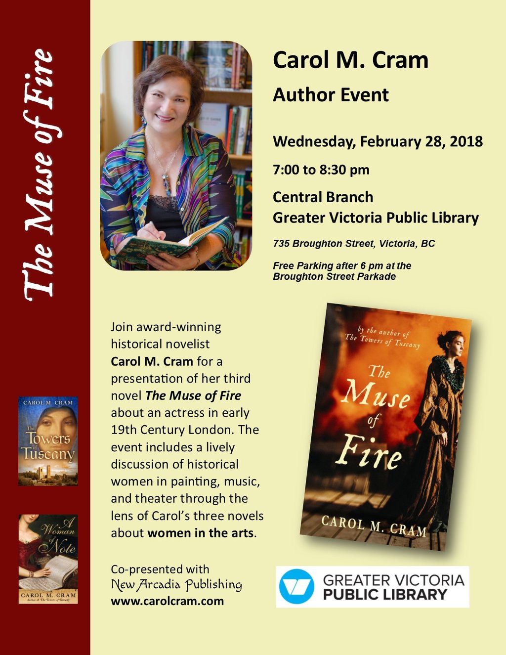 Award-winning BC author Carol M. Cram (The Towers of Tuscany, A Woman of Note) presents The Muse of Fire, which completes her historical fiction trilogy about women in the arts. The presentation features readings from all 3 novels and highlights the various art forms that inspired them. Carol also welcomes questions about writing & publishing.