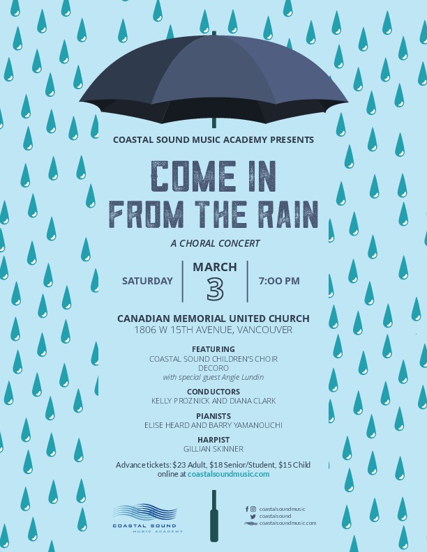 Come in From the Rain Choral Concert: Coastal Sound Music Academy @ Canadian Memorial United Church Mar 3 2018 - Jan 9th @ Canadian Memorial United Church