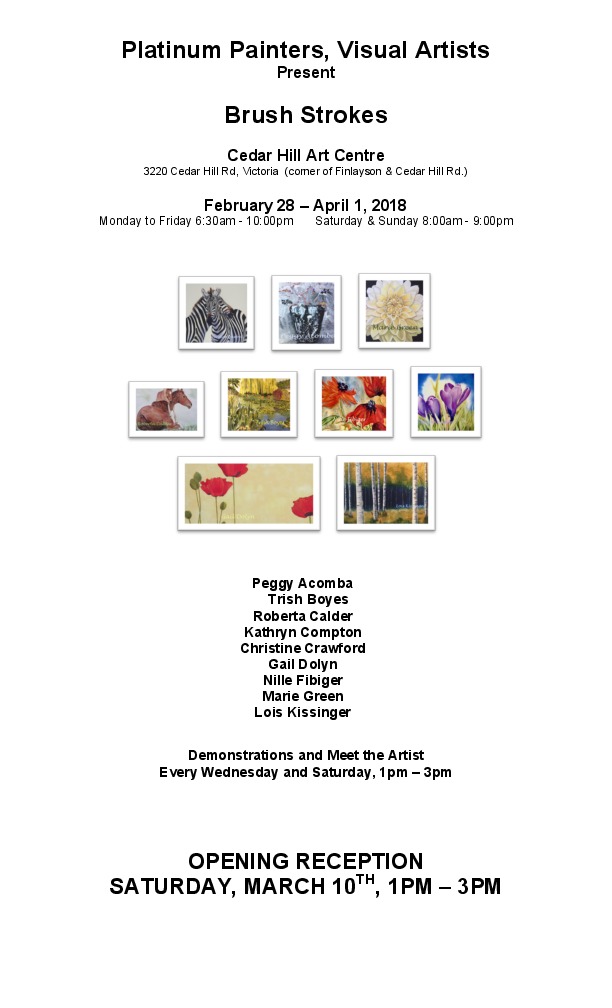 Platinum Painter's "Brush Strokes": Peggy Acomba, Marie Green, Trish Boyes, Lois Kissinger, Roberta Calder, kathryn compton, Christine Crawford, Gail Dolyn, Nille Fibiger @ The Arts Centre at Cedar Hill  Feb 28 2018 - Jan 11th @ The Arts Centre at Cedar Hill
