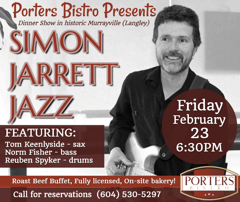 This Friday (Feb 23) at Porter's Coffee and Tea House - a stellar contemporary jazz lineup with the Simon Jarrett Jazz Group featuring Tom Keenlyside (sax), Norm Fisher (bass) and Reuben Spyker (drums.) You don't want to miss this: reservations are a must - call (604) 530-5297! We have a selection of reasonably priced entrees including our tasty schnitzel, salmon and pasta. Fully licensed, located in historical Murrayville (Langley.)