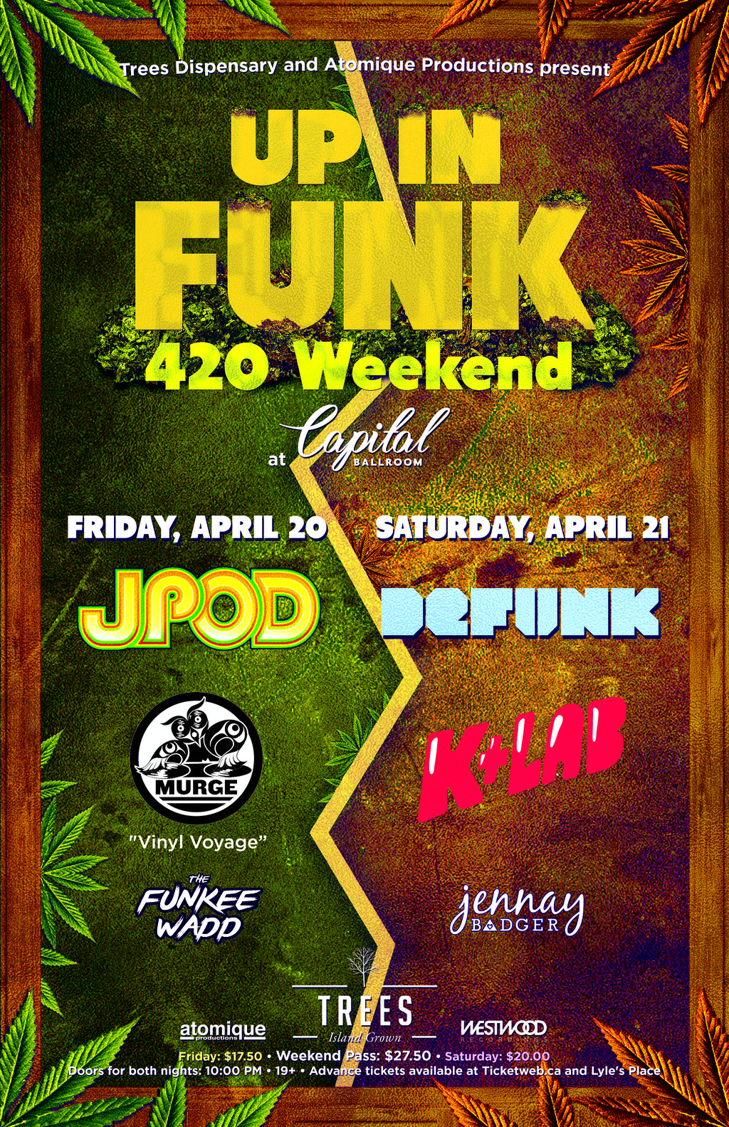 Trees Dispensary and Atomique productions present the inaugural Up In Funk 420 weekend with JPOD, Defunk, K+Lab, Murge's Vinyl Voyage, The Funkee Wadd, and Mykee! Over two nights (Friday, April 20 & Saturday, April 21) six DJs will spin funky tunes to celebrate BC's unofficial provincial holiday, 420!