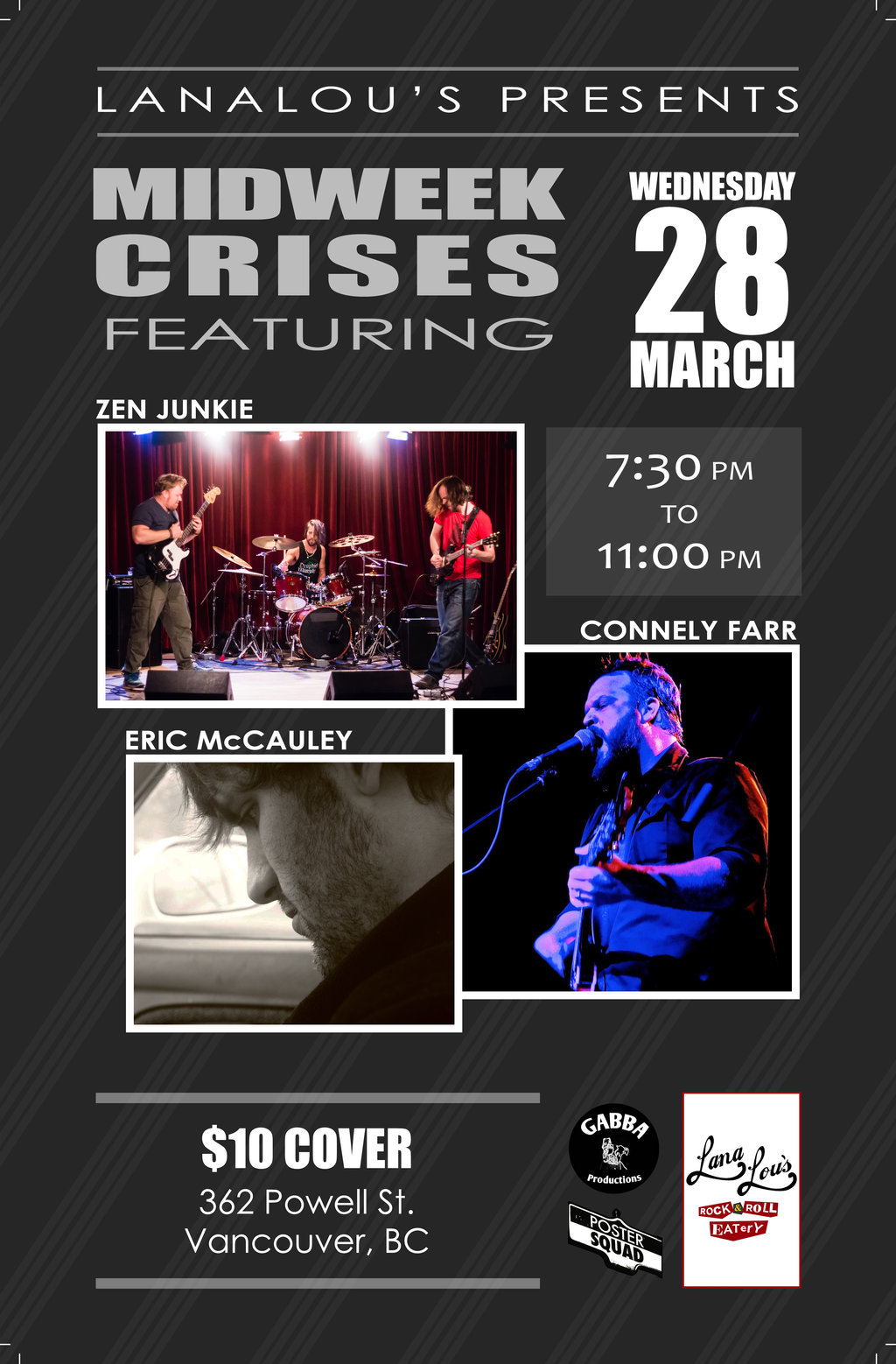 Come on down to the best Rock 'n' Roll Eatery in Vancouver. Chow down to an eclectic sampler of folk-rock, blues and indie. Featuring Barrie, ON's favourite son Eric McCauley, a rare solo by Vancouver legend Connely Farr (Mississippi Live & The Dirty Dirty) and the pride of New Westminster, Zen Junkie (Lucas Mercer - Guitar + Vocals - Trevor Sergius - Bass - Kevin Moser - Thwack Pots).