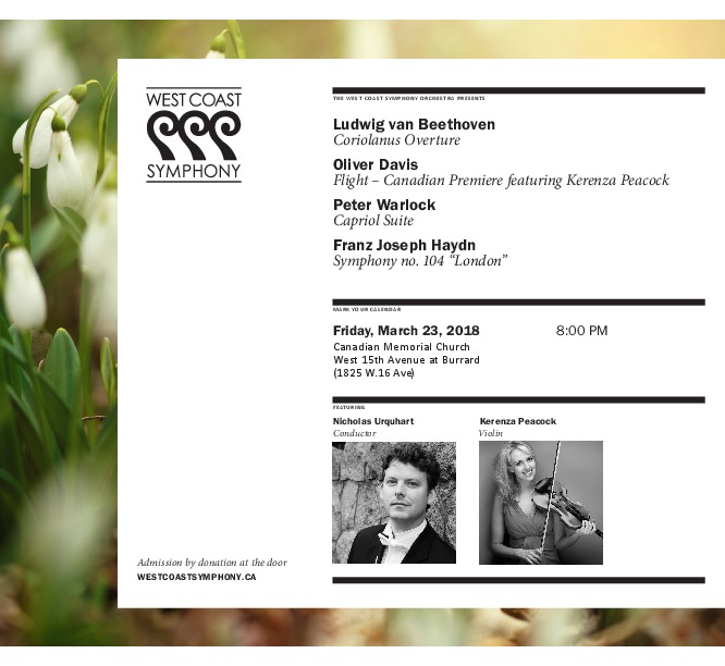Following a fantastic performance with us last October, Kerenza Peacock is returning for the Canadian premiere of "Flight": a concerto written for her by English composer Oliver Davis. "Flight" was premiered to rave reviews in the UK, and the resulting album reached #2 in the UK classical music charts.