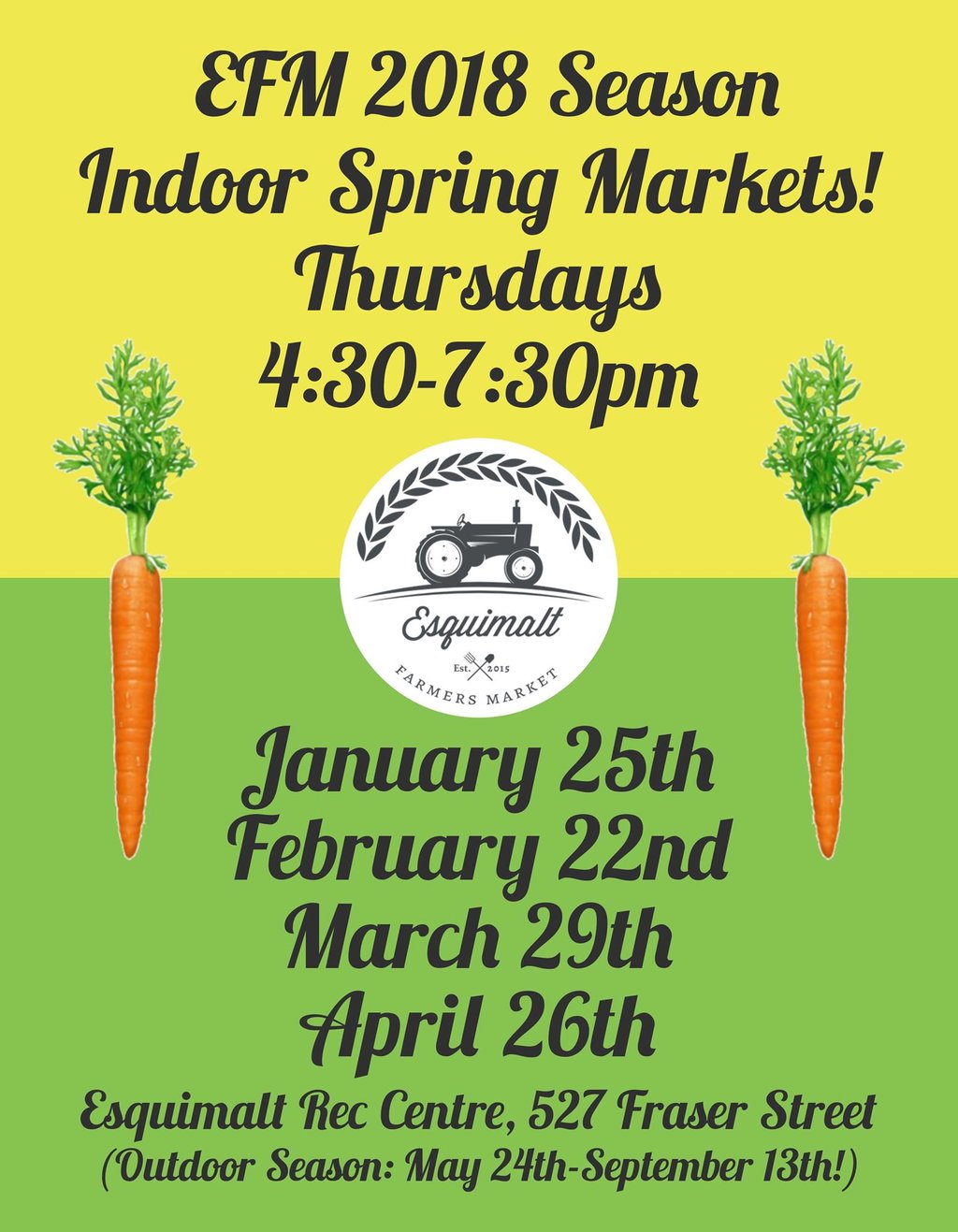 We continue our FOURTH season inside Esquimalt Rec Centre at 527 Fraser Street with an indoor market at the last Thursday of the month from January to April before we move outside, May 24th to Memorial Park at 1200 Esquimalt Road!